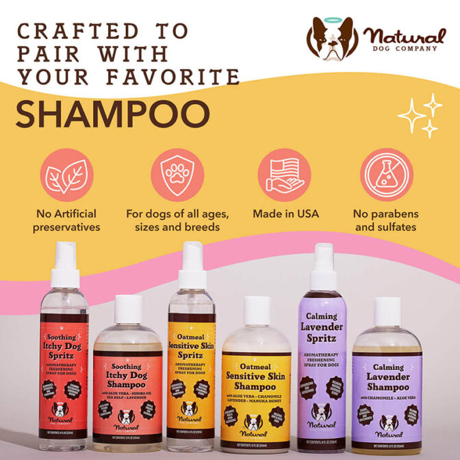 Sensitive Skin Spritzは、敏感肌を持つワンちゃんのための、消臭、保湿、肌を癒すスプレーです。乾燥やフケが気になるワンちゃんにも最適です。ラベンダー、カモミール、カレンデュラ、オートミールエキスなどのエッセンシャルオイルを配合し、清潔で穏やかな香りを提供しながら、清潔な状態に保ちます。さらに、アロエベラの保湿・癒し効果が、敏感肌のワンちゃんに快適で健康的な被毛をサポートします。